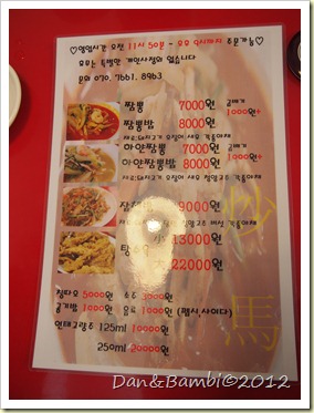 再來是菜單~由上往下依序是炒馬麵、炒馬飯、白炒馬麵、白炒馬飯、雜菜飯、糖醋肉,一如韓式餐廳的風格,選擇並不多,價格上是略為高了一點,而且沒有常見的炸醬麵。