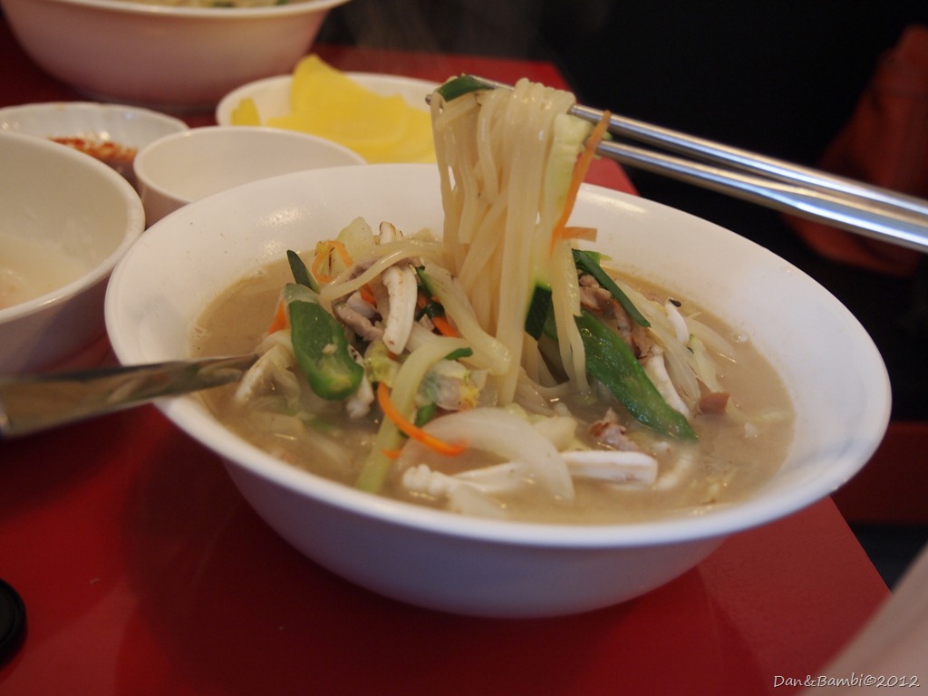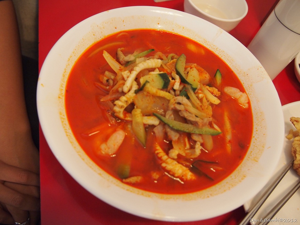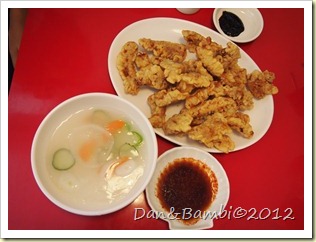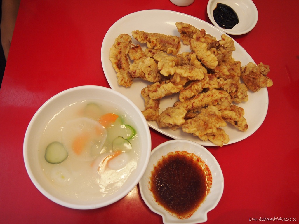 再來是糖醋肉,還記得斑比在上一篇介紹韓式中華料理的文章抱怨說韓國糖醋肉真的是很普通,總是粉比肉多很多,說實話,阿單自己也從沒吃到過令人滿意的糖醋肉,但這間店的糖醋肉真是不得不用力、大力的推薦一下!不僅肉比粉多,而且又非常鮮嫩!(雖然價格真的是頗高,小份的要韓幣13000)通常韓國的糖醋肉都是醬汁和肉分別上菜,旁邊那碗白白的就是"糖醋肉"的糖之所在,真的蠻甜的,裡面還漂浮著一些蔬菜,但阿單實在是不太愛這種甜甜的醬汁,單吃肉不沾醬就真的很棒很好吃很滿足囉:D