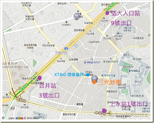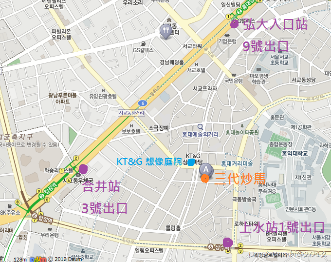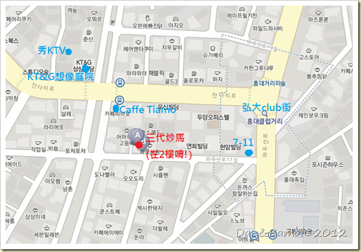 說實話,弘大附近的小路很多也很複雜,三代炒馬又在弘大站、合井站和上水站之間的小路間,不是很好找,建議大家可以先找到弘大新地標"KT&G想像庭院상상마당"以後,就能夠比較輕鬆地找到"三代炒馬"囉!