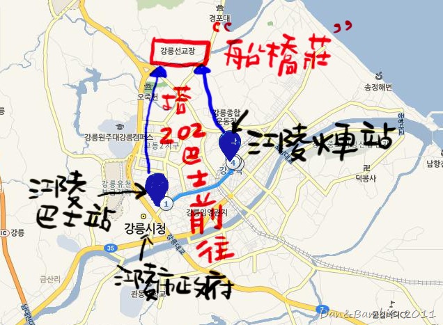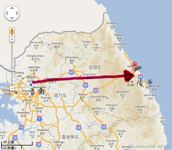1. 江南高速巴士總站(地鐵3號線1號出口)搭乘往江陵的巴士