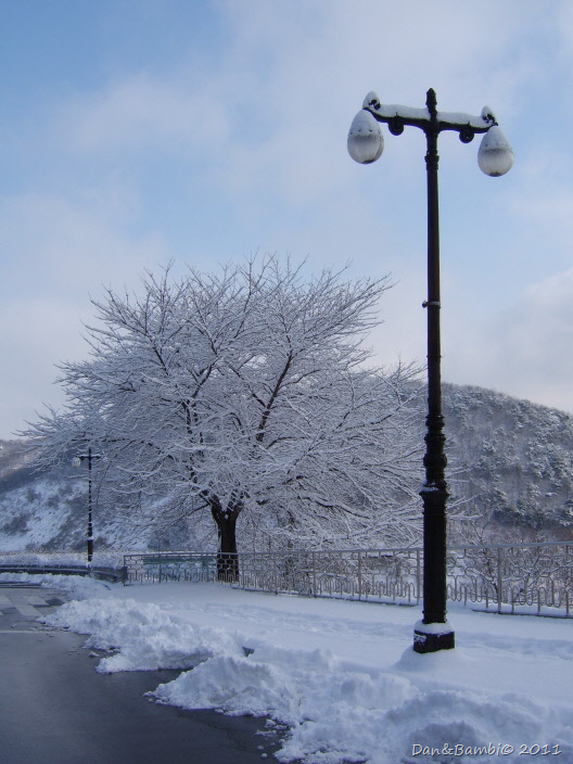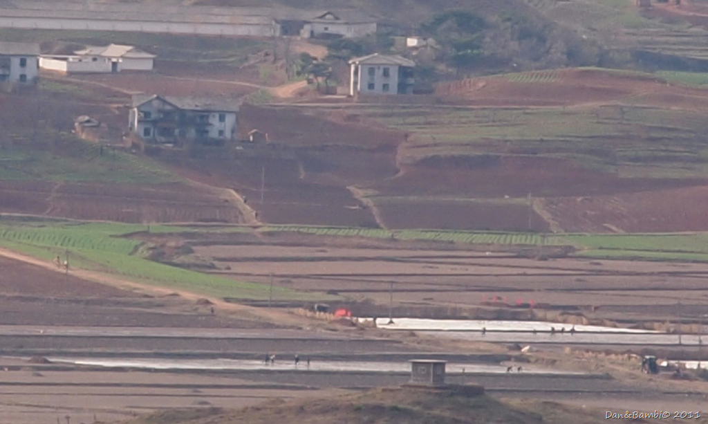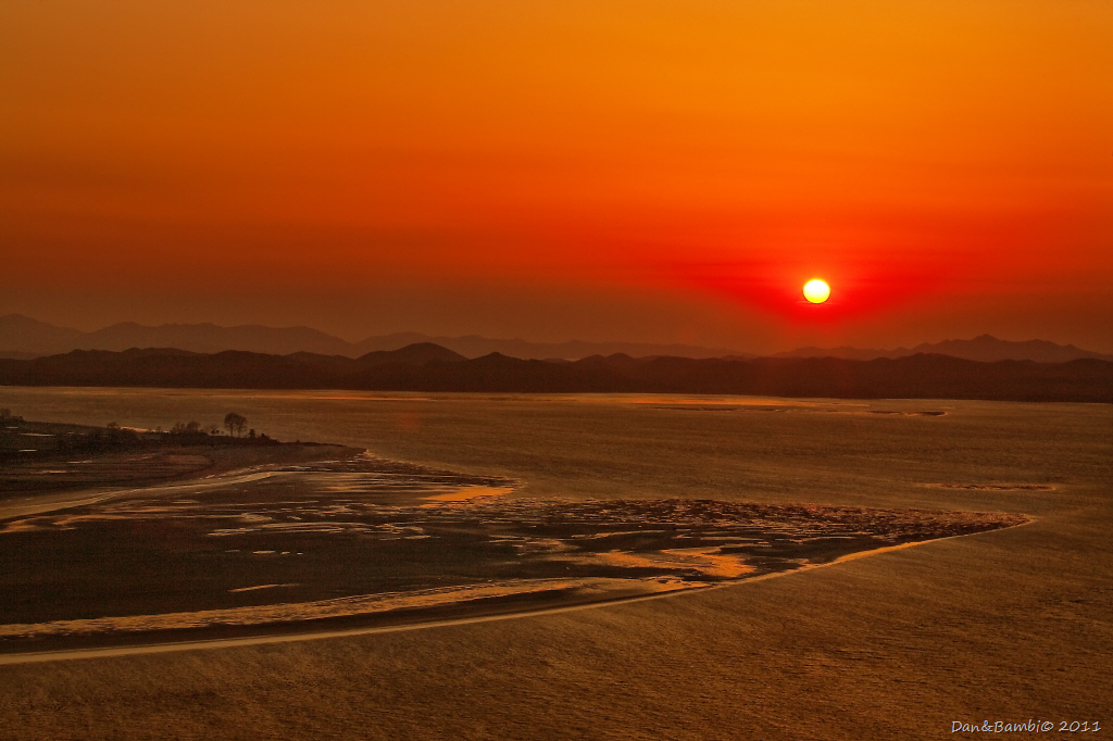 下圖為展望台看出去的夕陽、對面北韓進行農事的照片以及冬天下雪與春天櫻花綻放的展望台周邊風景!!很漂亮唄!!!