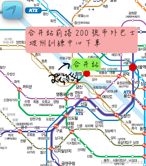 合井站前(地鐵2號線)搭200號市外巴士--1小時20分-->坡州訓練中心下車