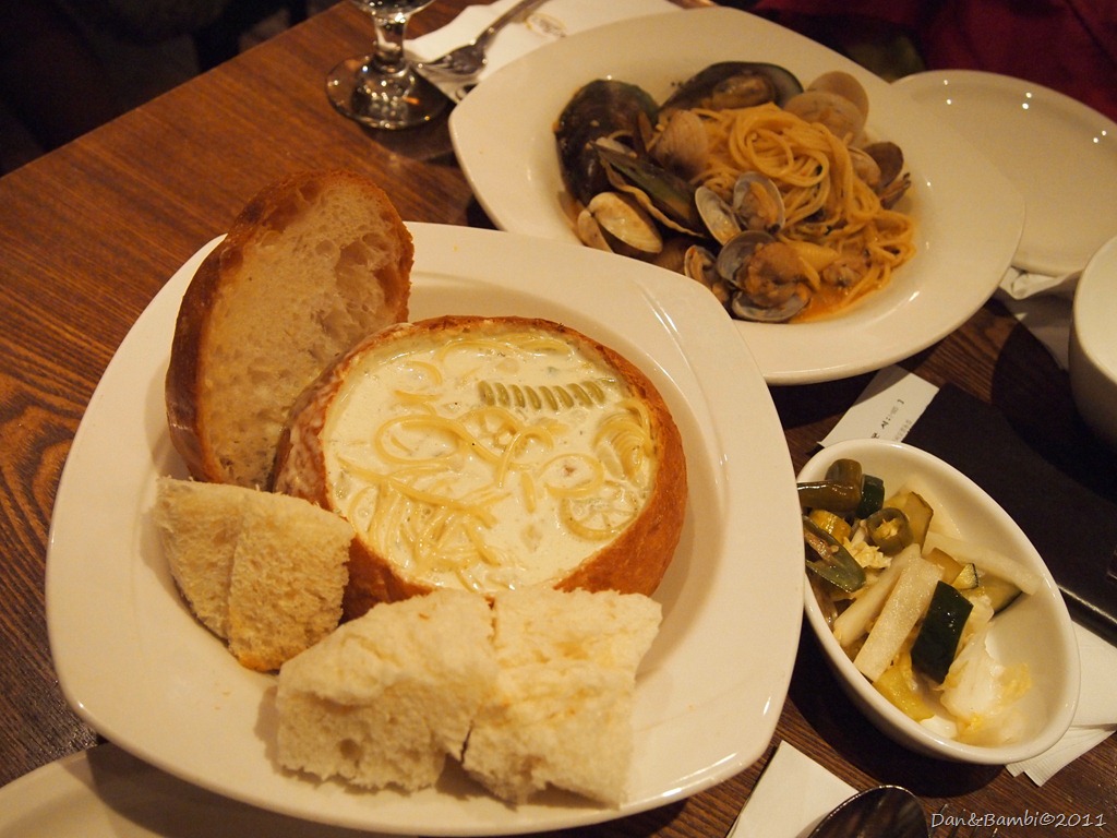 這裡沒有套餐式的組合,只能單點義大利麵,但會附上餐前麵包,醃小黃瓜,餐後甜點. 如果想要吃沙拉或湯,是需要單點的喔!