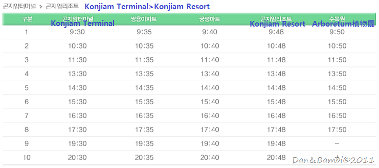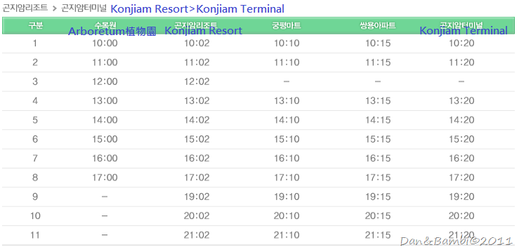 最後提供大眾交通方式給有興趣前往Konjiam渡假村遊玩或滑雪的朋友們, Konjiam位在首爾東南方的京畿道光州市. 在江邊站,蠶室站,江南站都有巴士可以到Konjiam Terminal(곤지암터미널),再從Konjiam Terminal搭乘免費的shuttle bus到Konjiam Resort(곤지암리조트)或植物園(수목원)下車即可.