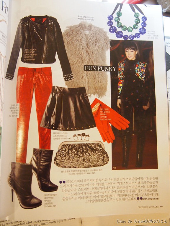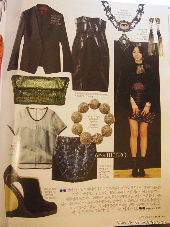 金敏熙這全黑的打扮使得身上的配件更為凸顯,呈現比較洗鍊俐落風格,雜誌中還介紹其他單品,像是特別造型合身西裝外套、皮質和布料拼貼洋裝等等,配件類則是推薦比較顯眼的顏色。