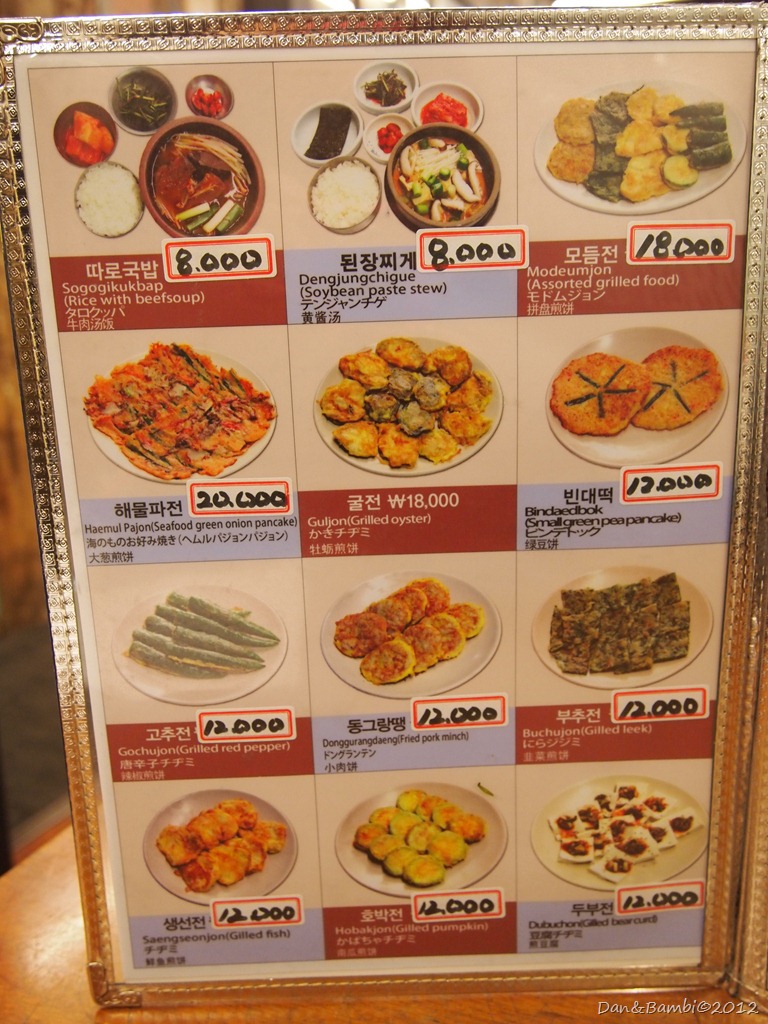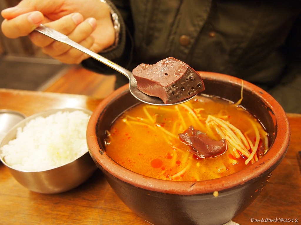 基於在台灣也常吃豬血鴨血的台灣人精神,想來牛血也沒什麼大不了嘛~勇敢咬下以後…發現...牛血的腥味還蠻重的...= =||b 而且雖然外表看來和豬血鴨血長得差不多,咬下去以後裡面竟然是很深深的咖啡色! 多吃幾口以後有習慣那個腥味了啦,尤其配著湯吃腥味就比較容易被蓋掉囉~也算是另類的韓國料理推薦給大家試試看囉!除了[牛血湯飯]以外,後來回家估狗以後發現這間餐廳的煎餅類也很出名喔!!大家如果來明洞,也可以試試看各式不同的煎餅喔~~(只是韓國煎餅的價格通常都不太親民啦:P)