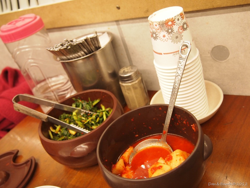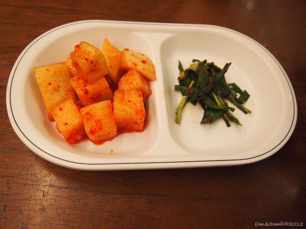 等待的時候先來試試小菜們~這間店是採取自助式,小菜都放在桌上,自己適量夾取,店裡提供的是辣蘿蔔和韭菜,但兩者都...不太好吃>"< (說到辣蘿蔔阿~台灣觀光客都知道的[土俗村蔘雞湯]的辣蘿蔔真是超好吃的!!)