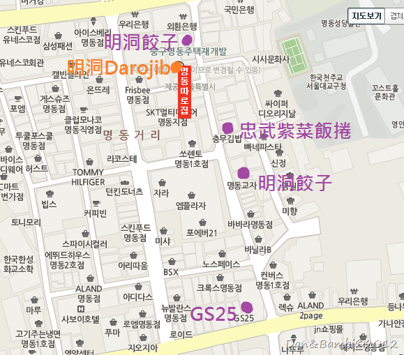 因為大家通常到明洞都會到處走走逛逛,所以直接介紹和其他著名地點的相對位置會更方便! [明洞Darojib]在著名的[明洞餃子명동교자]那條街上,[明洞餃子]有兩間,Darojib就在某一間的隔壁隔壁而已~同一條街上還有相當著名也很特別的[忠武紫菜飯捲충무김밥]喔!